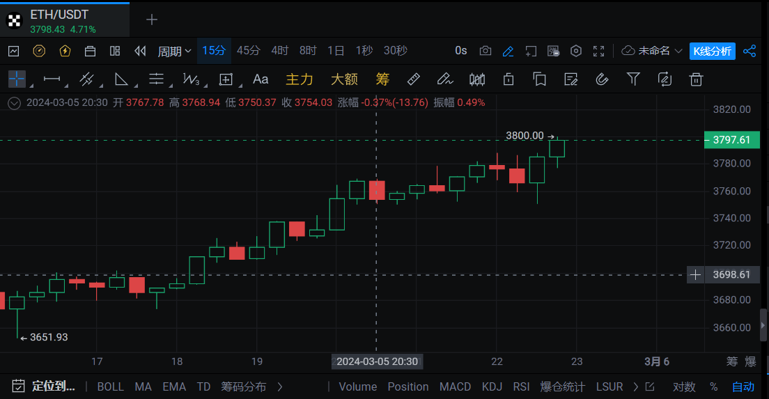 深潮 TechFlow 消息,据OKX行情显示,ETH突破3800美元,现报3798美元,24小时涨幅达7.7%。
