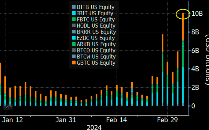 比特币现货ETF(含GBTC)单日交易量突破100亿美元,创历史新高