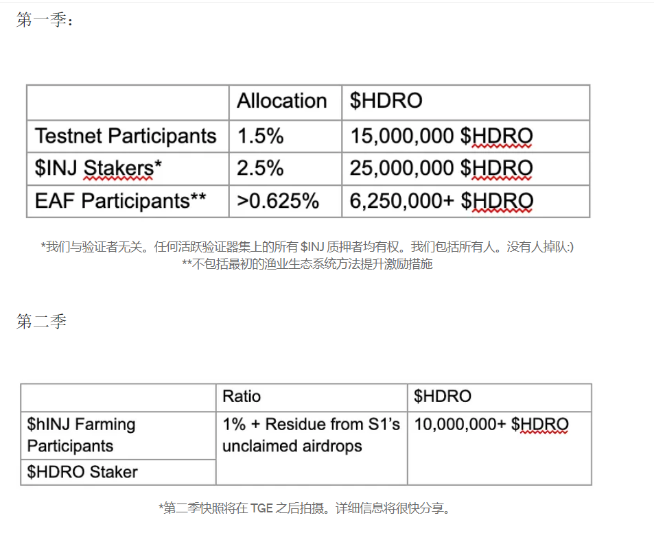 第一季将发放给参与 Hydro 开发和 Injective 早期用户,包括 Hydro Testnet 参与者、INJ 质押者(快照已于 2024 年 1 月 4 日拍摄)、Early Access Farming 活动参与者。