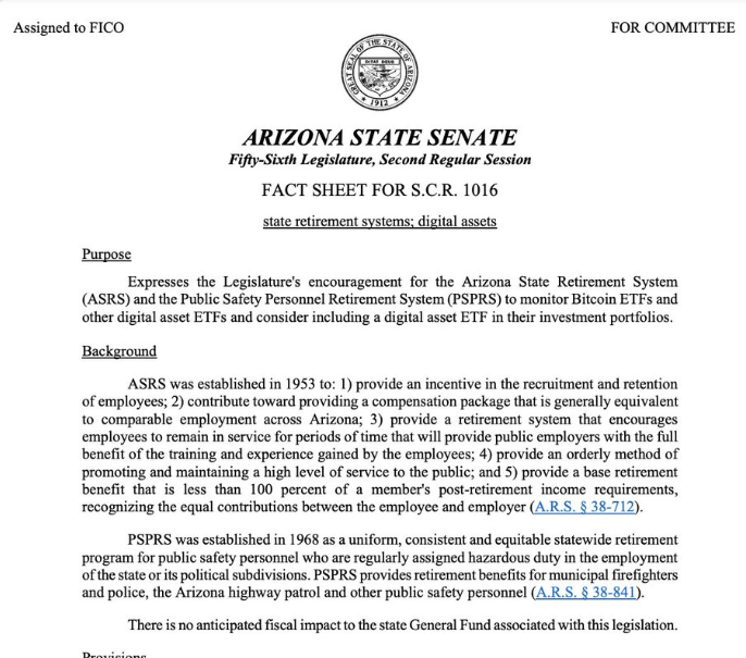 深潮 TechFlow 消息,Bitcoin Magazine在X披露,美国亚利桑那州参议院正在考虑将比特币ETF添加到其州退休投资组合中。
