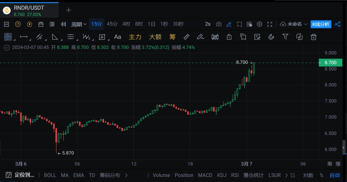 或受Render创始人出席GTC24大会消息影响,RNDR上涨突破8.7美元