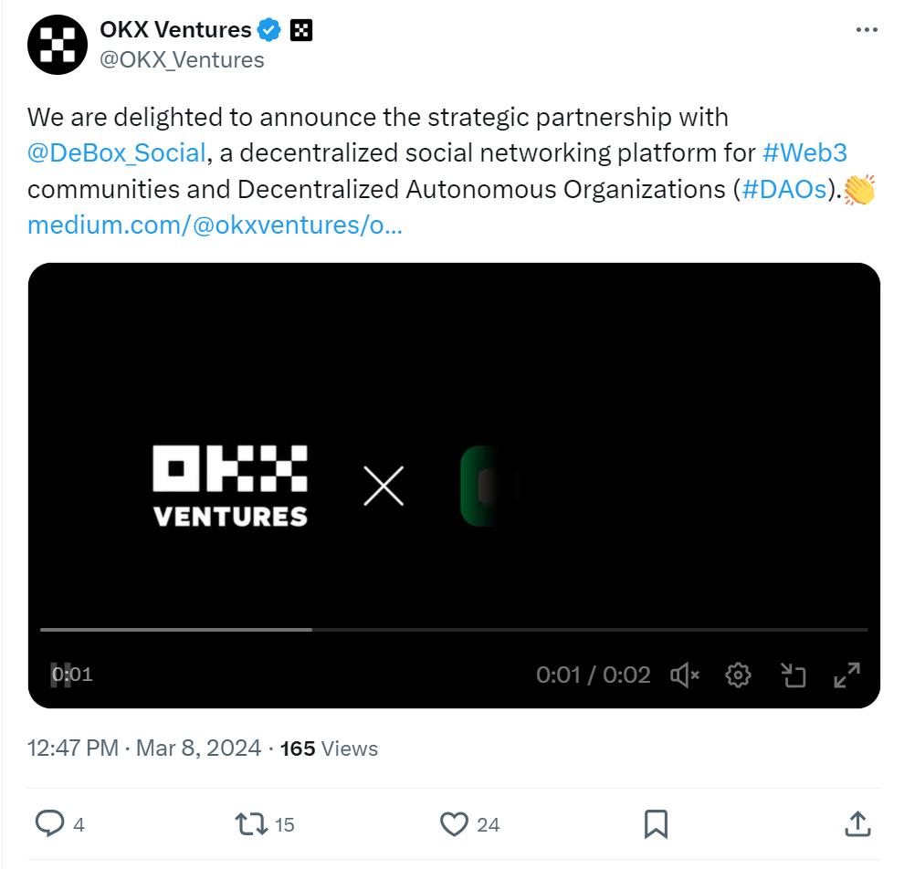 一站式社交平台 DeBox 宣布获得来自 OKX Ventures 融资,融资金额暂未披露