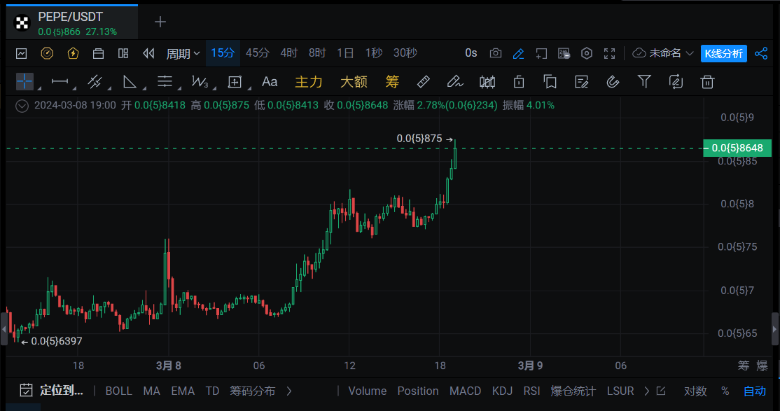 深潮 TechFlow 消息,据 OKX 行情数据,PEPE 突破 0.00000875 美元,现报0.00000866 美元,日内涨幅达 27.13%,创历史新高。