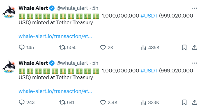 深潮TechFlow消息,据 Whale Alert 数据,Tether 于 5 个小时前在以太坊网络增发 20 亿枚 USDT。