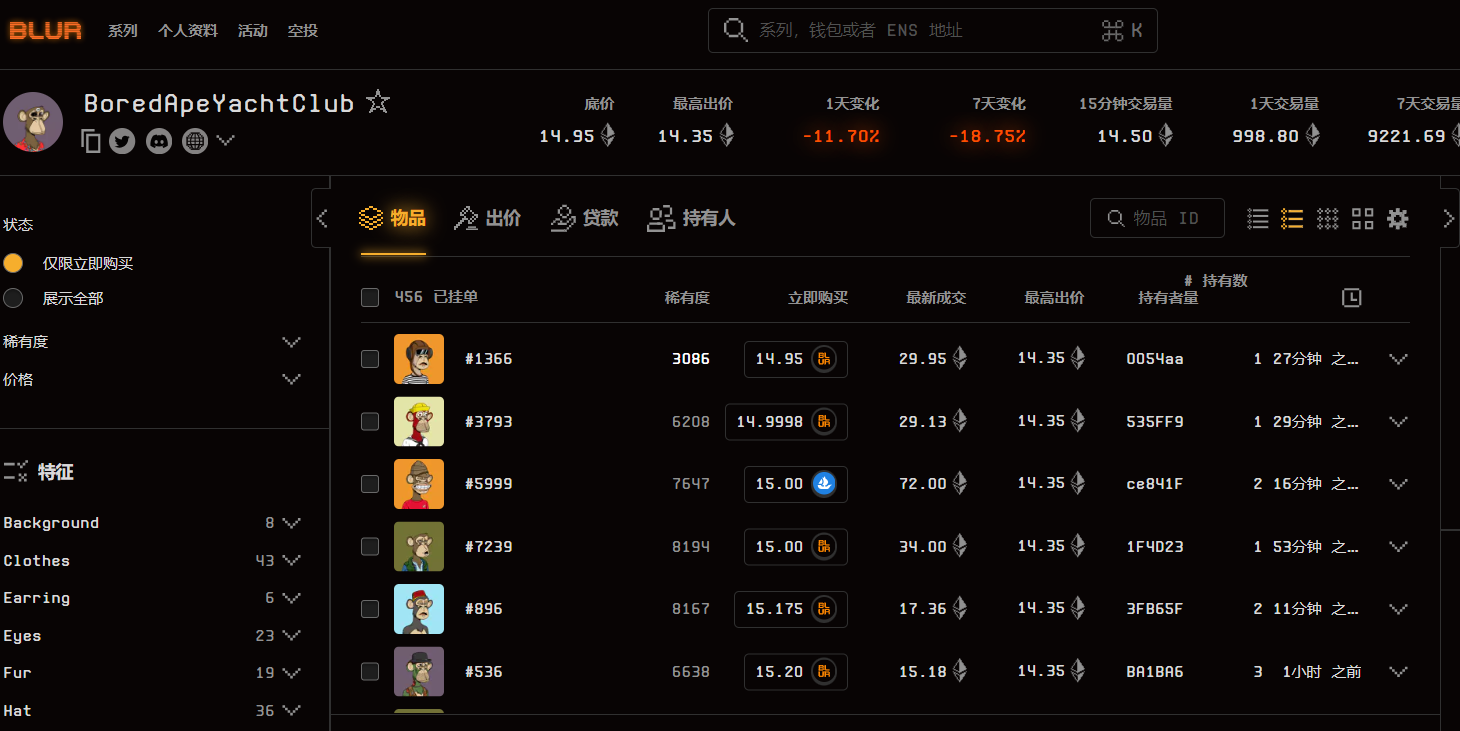 深潮 TechFlow 消息,据Blur数据显示,BAYC地板价跌破15 ETH,24小时跌幅达11.7%,7 日跌幅为18.75%。