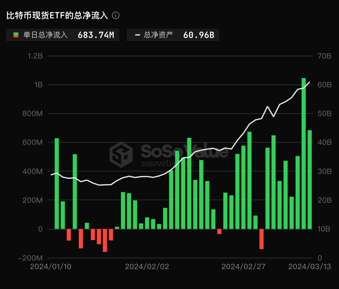 深潮 TechFlow 消息, 根据 SoSoValue 数据,昨日(美东时间 3 月 13 日)比特币现货 ETF 总净流入 6.83 亿美元。
