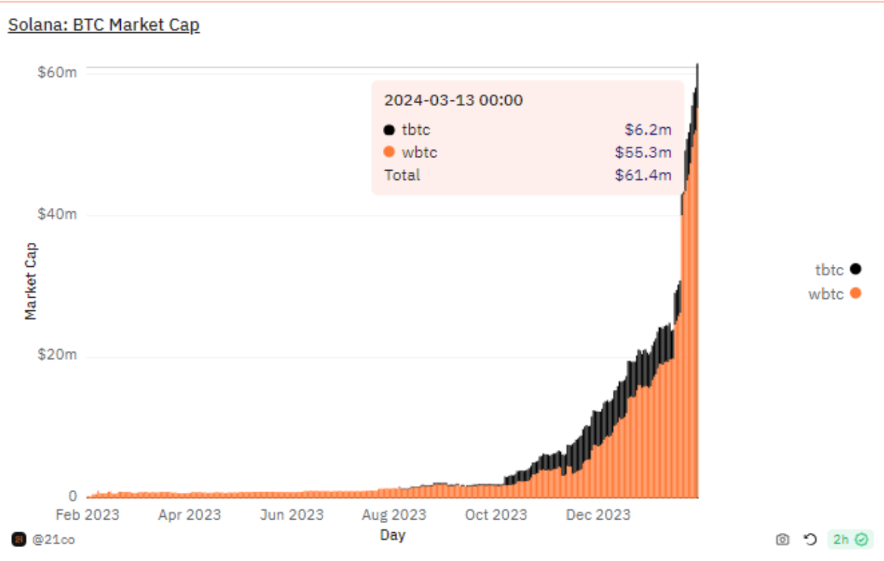 Solana上的tbtc和wbtc总市值已飙升超6000万美元,创历史新高
