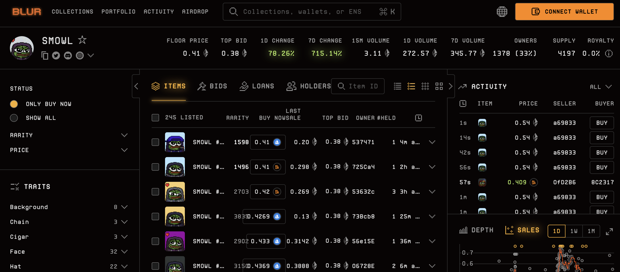 BOME 创始人此前推出的 NFT 系列 SMOWL 地板价突破 0.4 ETH,7 日涨幅达 715.14%