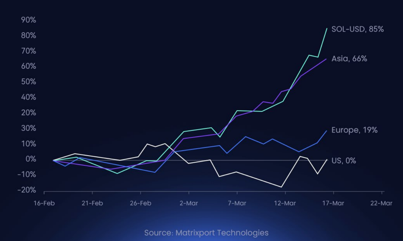 Solana过去30天内上涨85%,其中66%发生在亚洲交易时段