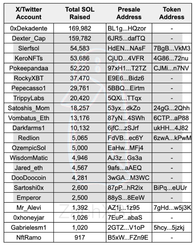深潮 TechFlow 消息,据链上侦探ZachXBT数据披露,Solana生态上27次预售筹集了超过655,000 SOL(价值1.225亿美元)。其中前三名为: