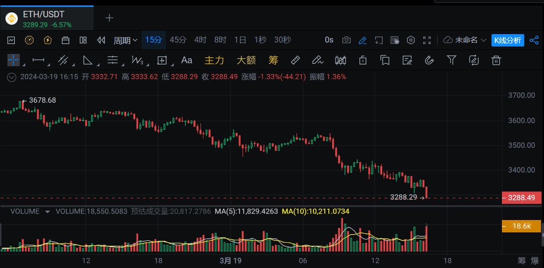 深潮 TechFlow 消息,据币安行情显示,ETH跌破3300美元,现报3289美元,日内跌幅达6.57%。