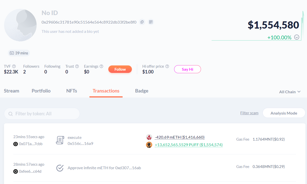 深潮 TechFlow 消息,据Debank数据显示,某地址约30分钟前花费420枚ETH购买1365万枚Mantle上Meme项目代币Puff,价值约合155万美元。