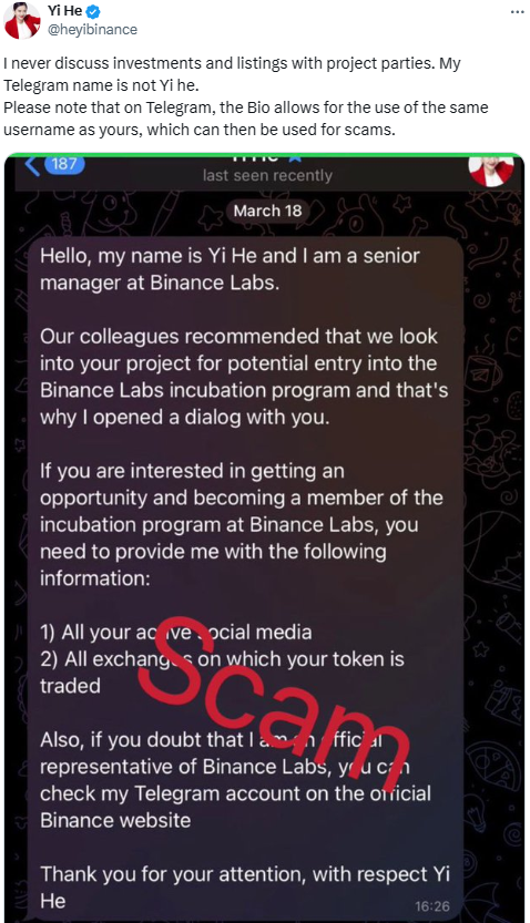 深潮 TechFlow 消息,币安联合创始人何一在X表示:”我从不与项目方讨论投资和上市事宜,Telegram 名称也不是 Yi he。请注意,Telegram的规则允许用户使用相同的用户名,这可能会被用于诈骗。"