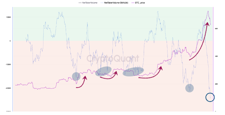图中紫色粗线代表比特币价格,蓝色细线代表 Taker Buy&Sell CVD。Taker Buy&Sell CVD "显示的是多头和空头交易量之差的趋势。 该指标还显示 0 为中性,绿色区域为多头超过空头,红色区域为空头超过多头。