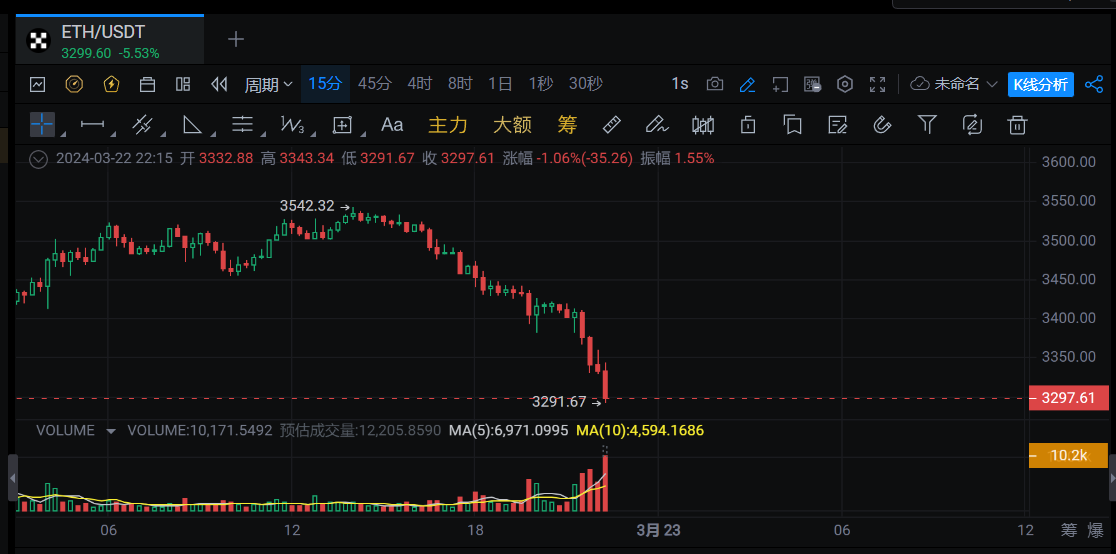 深潮 TechFlow 消息,据 OKX 行情数据显示,以太坊跌破 3300 美元,现报价 3299 美元,24 小时跌幅 5.53%。