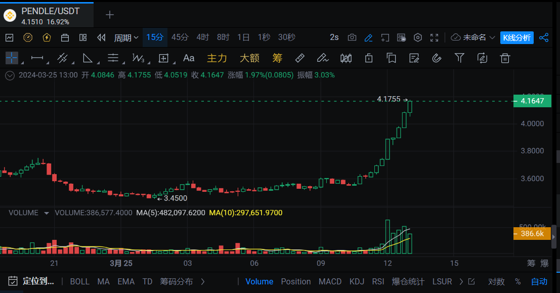 深潮 TechFlow 消息,据币安行情数据显示,PENDLE 突破4.1美元,创历史新高,24小时涨幅达16.92%,现报价4.15美元。