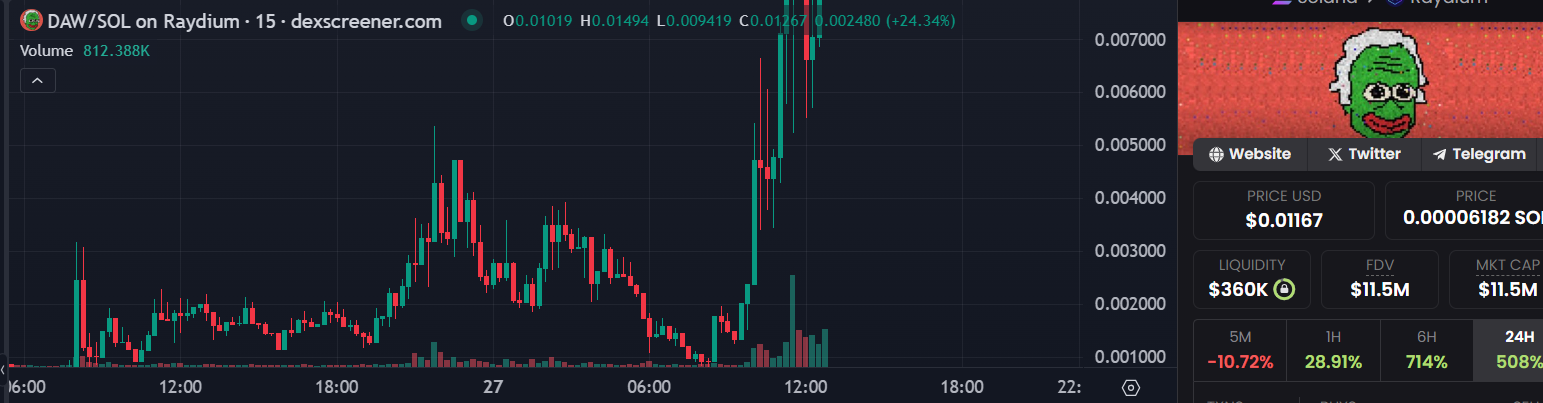 Solana上Meme币DAW突破0.011美元,24小时涨幅达508%