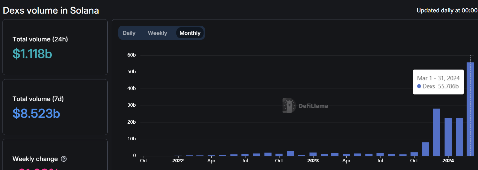 深潮 TechFlow 消息,据Defillama数据监测,本月Solana链上DEX交易量已超500亿美元,现为557.86亿美元,为上月的两倍,创历史记录。