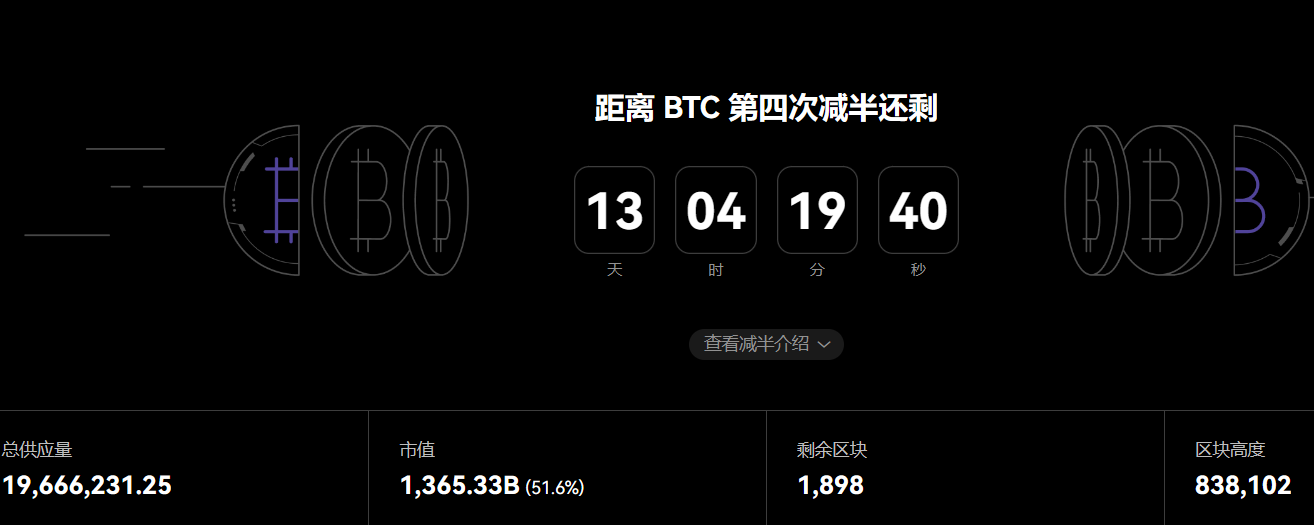 深潮 TechFlow 消息,BTC减半预计在2024年4月20日完成,倒计时仅剩13天。当前区块奖励为6.25 BTC,减半后区块奖励为3.125 BTC。目前剩余区块为1898。