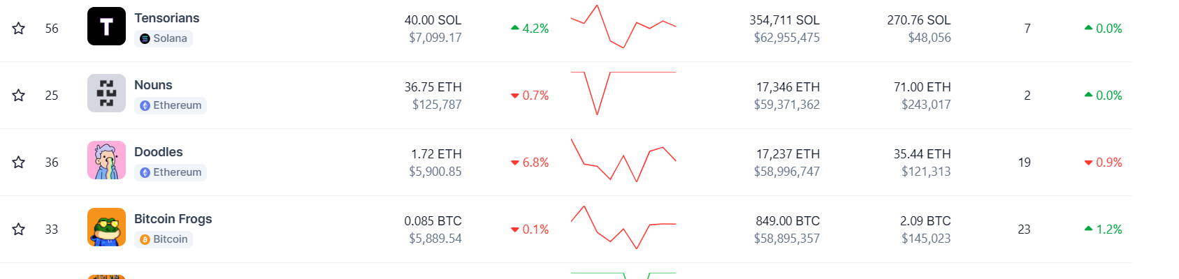 深潮 TechFlow 消息,据coingecko数据,Solana生态NFT市场Tensor旗下NFT Tensorians 地板价突破40 SOL,24小时涨幅达4.2%,市值约为6295万美元,超过Doodles(5899万美元)。