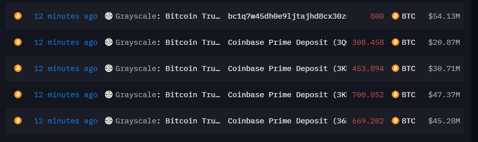 灰度12分钟前向Coinbase Prime转入约2131枚BTC