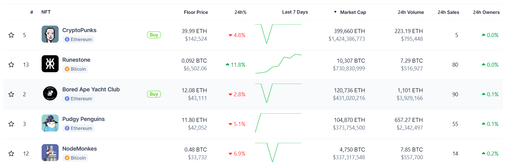深潮 TechFlow 消息,据 CoinGecko 数据显示,Runestone 市值达 10307 BTC,约合 7.3亿美元,仅次于 CryptoPunks。