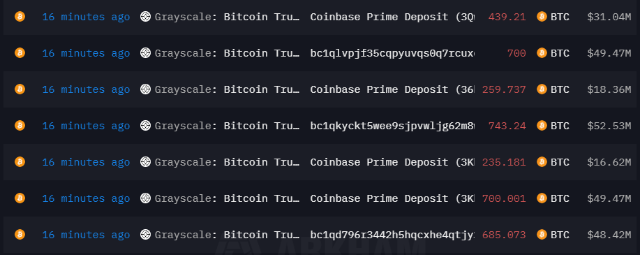 灰度于16分钟前向Coinbase Prime等地址转移超3760枚BTC