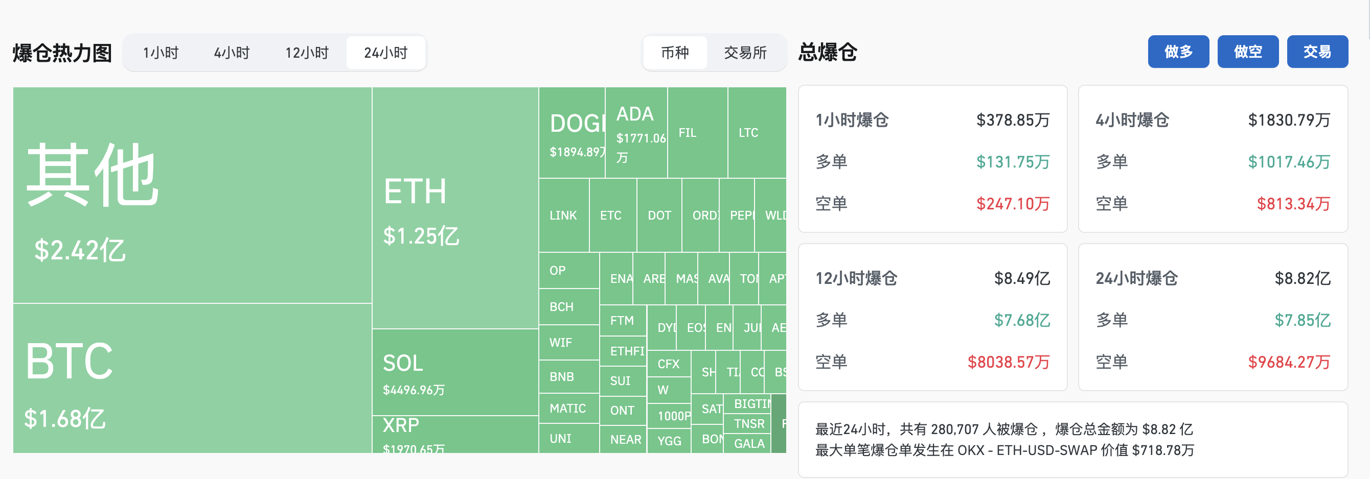 过去 24 小时全网合约爆仓 8.82 亿美元,其中多单爆仓 7.87 亿美元