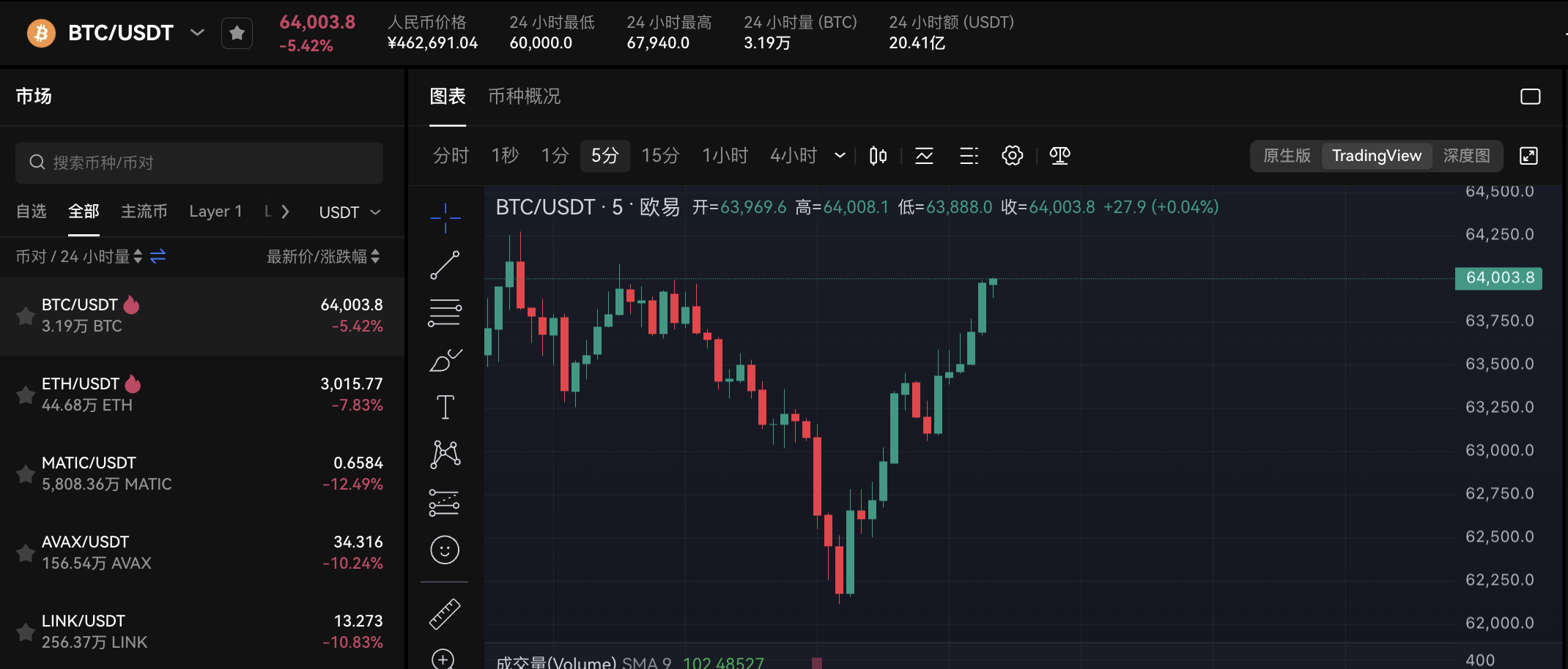 深潮 TechFlow 消息,据 OKX 行情数据显示,BTC 回升至 64,000  美元上方,现报价 64,003.8 美元,日内跌幅收窄至 5.42%。