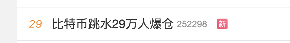 微博词条「比特币跳水 29 万人爆仓」登上热搜榜第 29 位