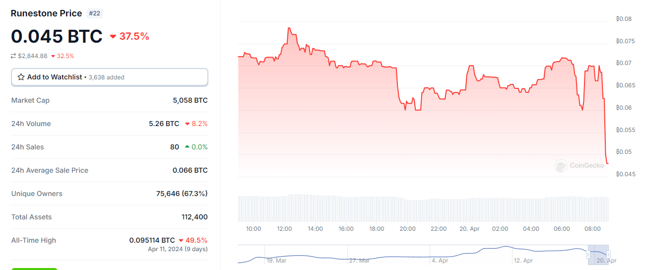 Runestone地板价短时暴跌,现跌破0.05 BTC,1小时跌幅37.5%