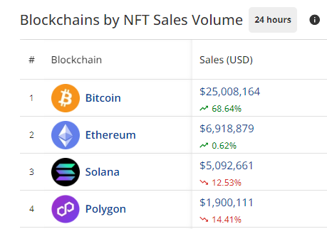 过去24小时比特币链上NFT销售额超2500万美元,是以太坊的近4倍