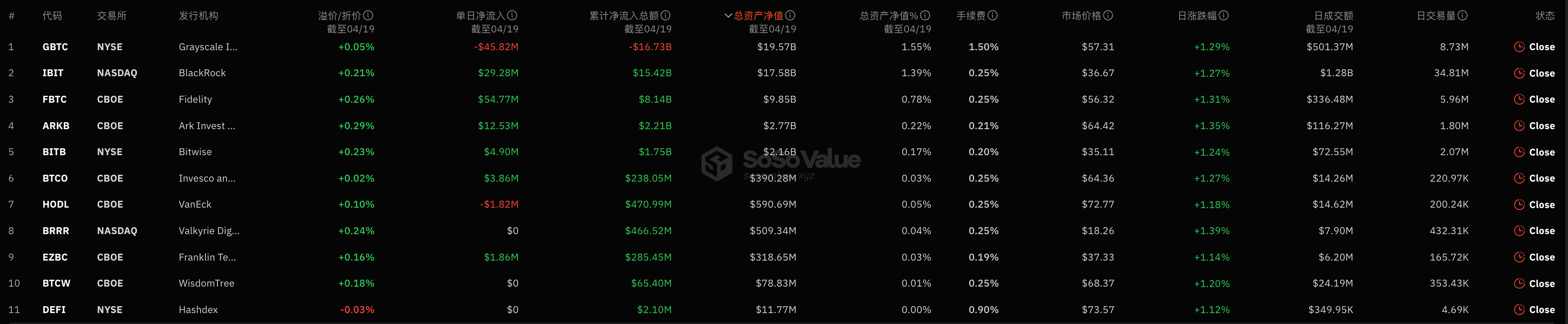 深潮 TechFlow 消息,根据 SoSoValue 数据,昨日(美东时间 4 月 19 日)比特币现货 ETF 总净流入 5955.80 万美元。昨日灰度(Grayscale)ETF GBTC 单日净流出 4582.46 万美元,目前 GBTC 历史净流出为 167.31 亿美元。