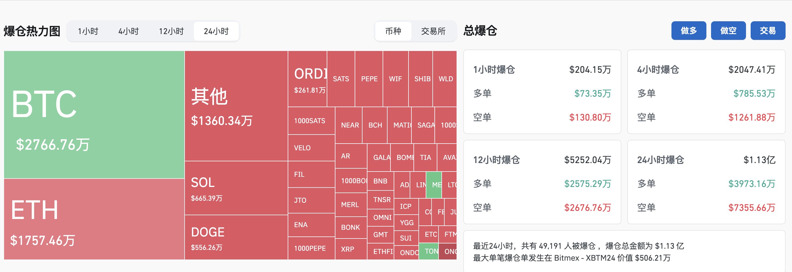 过去24小时全网合约爆仓1.13亿美元,其中空单爆仓7355.66万美元