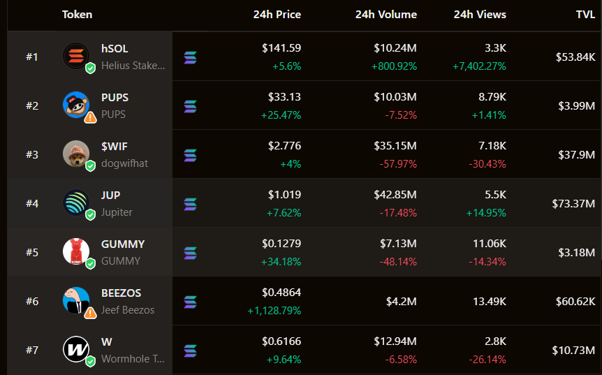 Helius推出的LST代币hSOL为Solana链上最热门的代币,PUPS和WIF位列第二和第三