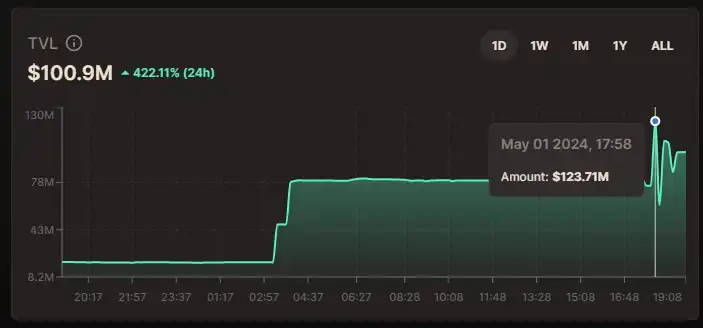 深潮 TechFlow 消息,据 Dymension 官方数据显示,Dymension TVL(包括流动性池中的 IBC 代币以及 DYM)日内最大涨幅达 547%,从约 1910 万美元水平,最高升至 1.23 亿美元,现报 1 亿美元。