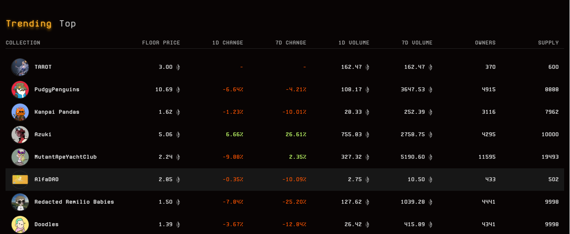 深潮 TechFlow 消息,MATR1X生态3A级放置Roguelike RPG游戏Castile的创世NFT TAROT已全部Mint结束 ,据Blur数据显示,TAROT地板价从0.3E涨至3E,涨幅1000%,目前在BLUR热门榜排名第一。