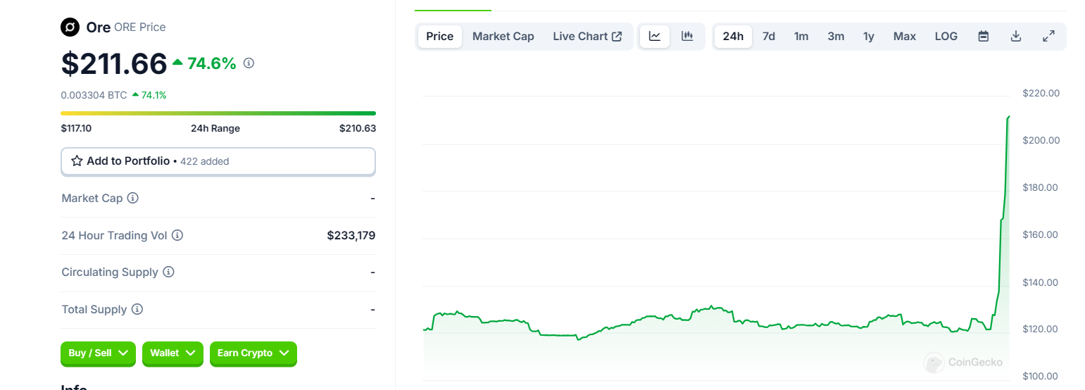 或受获得Solana Renaissance黑客松总冠军影响,Ore代币ORE上涨74.6%