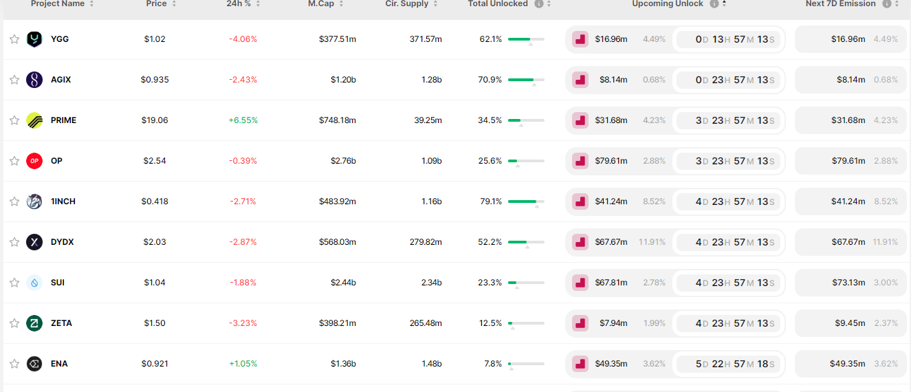 YGG、PRIME、1INCH等本周将迎来一次性大额解锁,DYDX将解锁超6700万美元