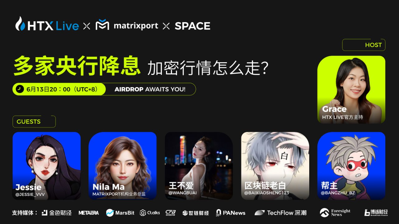 深潮 TechFlow 消息,据火币HTX官方社媒消息,Matrixport机构业务总监Nila Ma,加密KOL Jessie、王不爱、区块链老白、帮主将于今日20时(UTC+8)做客火币直播。此次直播以“多家央行降息,加密行情怎么走?”为主题,探讨新一轮宽松周期中,加密行情的机遇与挑战以及市场投资策略。本次直播还将通过火币HTX推特Space同步进行,更有大量空投活动,敬请期待。