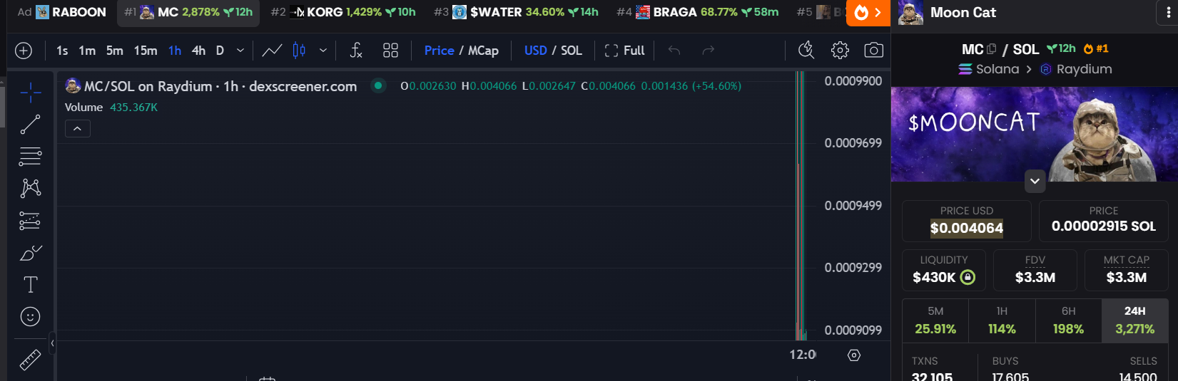 深潮 TechFlow 消息,据dexscreener数据,Solana生态meme项目Moon Cat代币MC 突破0.004美元,24小时涨幅达3271%,市值已超330万美元,其流动性为43万美元。
