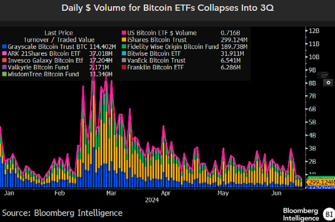 彭博 ETF 分析师 James Seyffart 在 X 平台发文称,美国比特币 ETF 的资金流基本停滞,净流入自推出以来达到 147 亿美元。然而,该组 ETF 的交易量自 5 月中旬以来一直呈下降趋势,未能突破 30 亿美元。