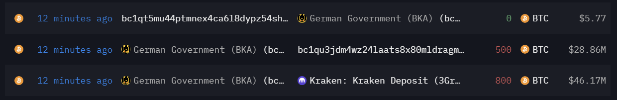 德国政府地址向 Kraken 转入800 枚 BTC,今日累计已转移 5848 枚