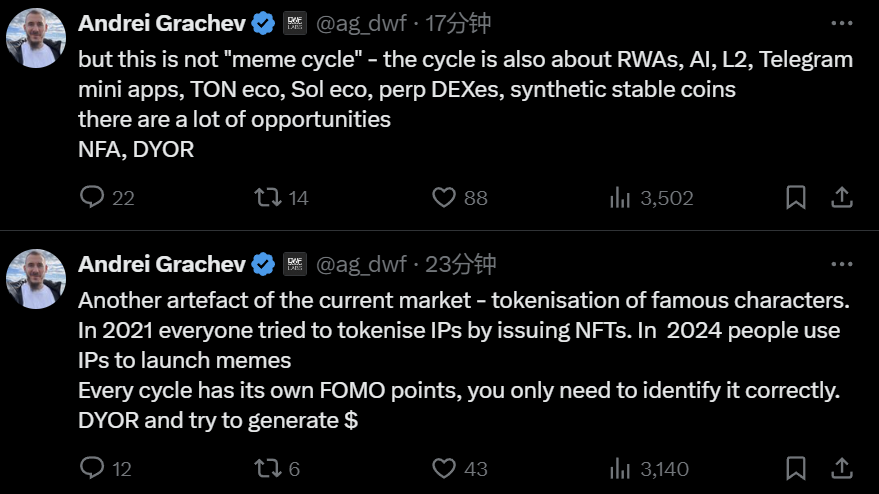 深潮 TechFlow 消息,7 月 23 日,DWF Labs 合伙人 Andrei Grachev 在 X 平台发文表示,当前市场的一个特征是著名角色的代币化。2021年,市场通过发行NFT尝试代币化知识产权,而在2024年,人们则利用这些知识产权推出Meme。Grachev强调,每个周期都有其特定的 FOMO 点,投资者只需正确识别,并进行深入研究(DYOR),努力创造收益。