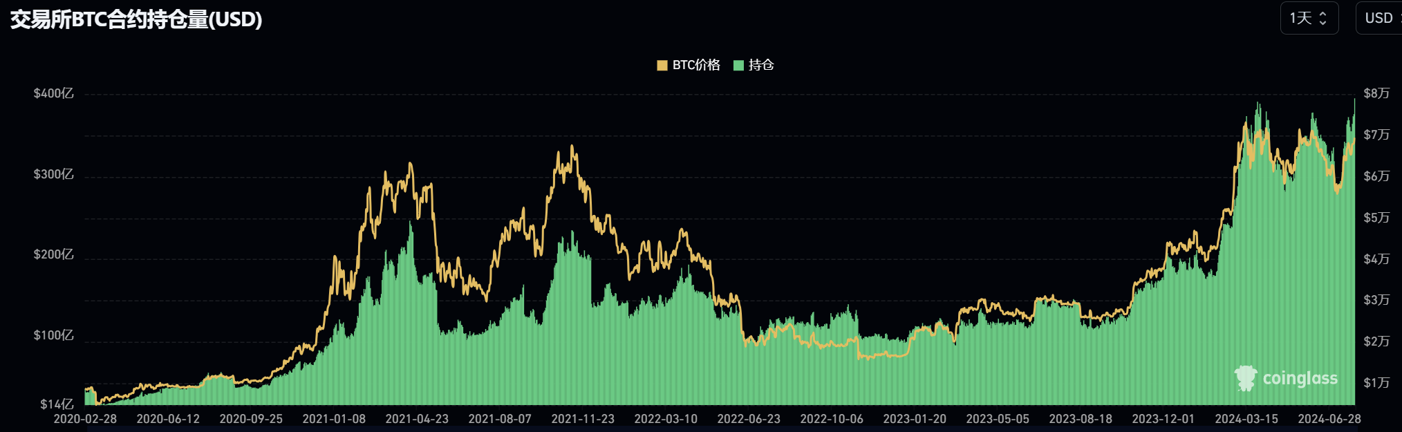 深潮 TechFlow 消息,7 月 29 日,据 CoinGlass 数据,全网比特币合约持仓量创下 394.6 亿美元的新高,超越 2024 年 3 月 29 日的 390.3 亿美元历史纪录,显示出市场对比特币的强烈需求,或预示着币价即将突破。