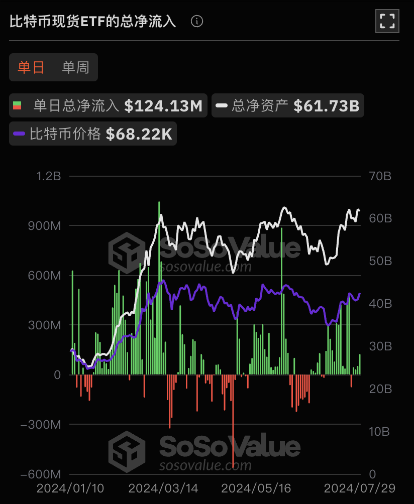 比特币现货 ETF 昨日总净流入 1.24 亿美元,持续 4 日净流入