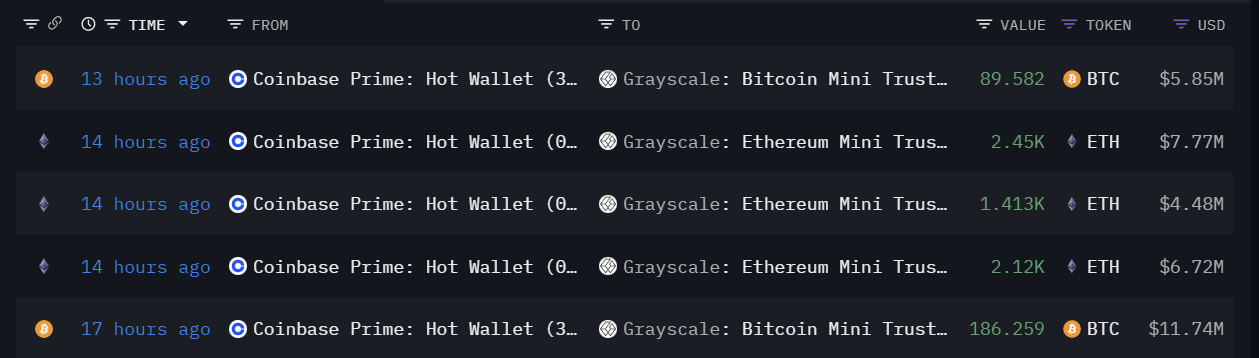 今晨灰度两个迷你信托地址从 Coinbase Prime 地址接收 275.84 枚 BTC 和 5983.62 枚 ETH