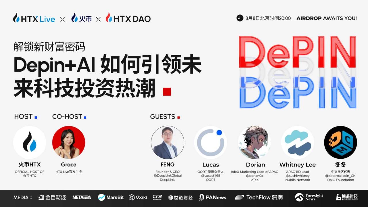 深潮 TechFlow 消息,8 月 8 日,据HTX DAO官方社媒消息,DeepLink创始人兼CEO FENG、OORT华语负责人Lucas、IoTeX亚太区市场负责人Dorian、Nubila Network亚太区业务负责人Whitney Lee、DMC Foundation中文社区代表冬冬将于今日20时(UTC+8)做客火币直播。此次直播以“解锁新财富密码:DePIN+AI如何引领未来科技投资热潮”为主题,探讨DePIN与AI结合相关的生态建设和广阔投资应用前景。本次直播还将通过火币HTX DAO推特Space同步进行,更有海量空投,敬请期待。