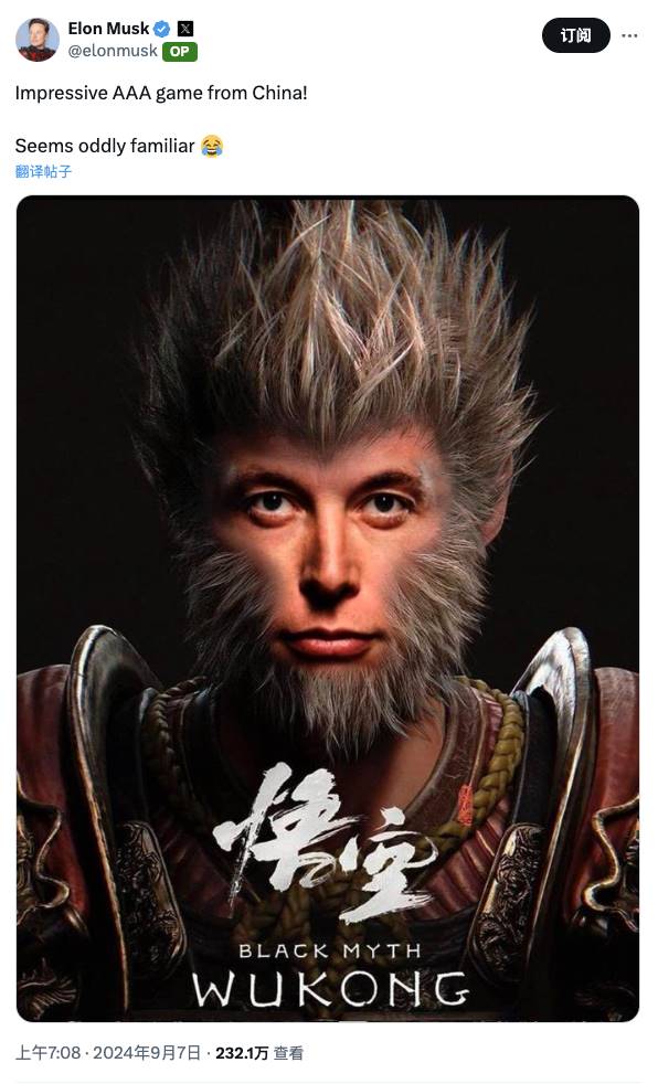 深潮 TechFlow 消息,马斯克在 X 社交平台上发布了一张根据其个人形象进行 AI 合成的《黑神话:悟空》面部肖像图,并配文「来自中国的令人印象深刻的 AAA 级游戏」。