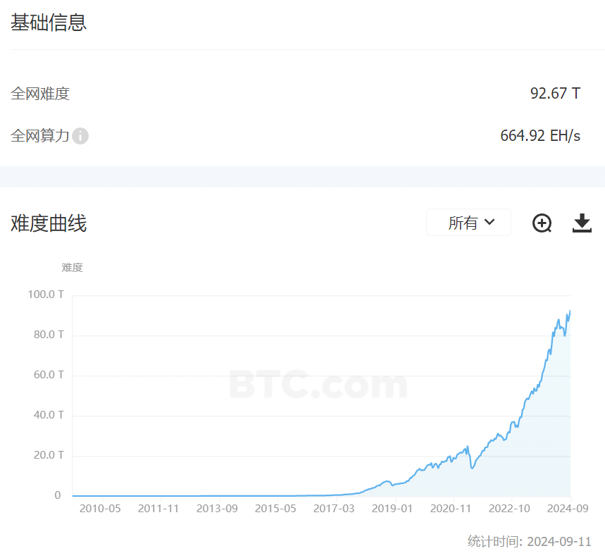 深潮 TechFlow 消息,9 月 11 日,据 BTC. com 数据显示,比特币挖矿难度在区块高度 860,832 处(9 月 11 日 11:25)迎来挖矿难度调整,挖矿难度上调 3.58% 至 92.67 T,创历史新高。